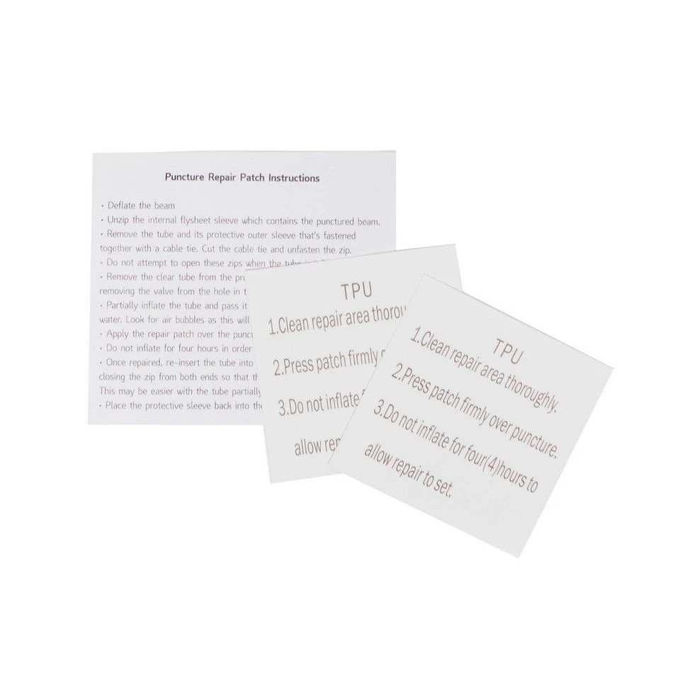 Replacement puncture repair patches for inflatable tents. Easy to use and very reliable. For use in the field.